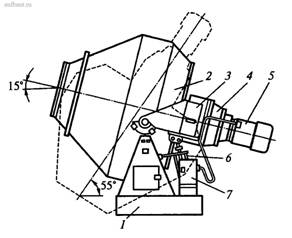 Футерованная облицовкой внутренняя поверхность двухконусного барабана имеет шесть лопастей, закрепленных на кронштейнах-держателях. В днище барабана установлен лопастной активатор, позволяющий ускорять процесс перемешивания и повышать качество приготовляемых смесей. Вращение смесильному барабану с частотой 17,6 мин-1 сообщается от фланцевого электродвигателя 5 через двухступенчатый планетарный редуктор 4.