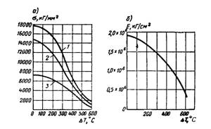 Рисунок 1. Изменение механических свойств высокопрочной проволоки диаметром 5 мм (ГОСТ 7348-63): а - временное сопротивление (1); предел текучести (2); предел упругости (3); б - модуль упругости