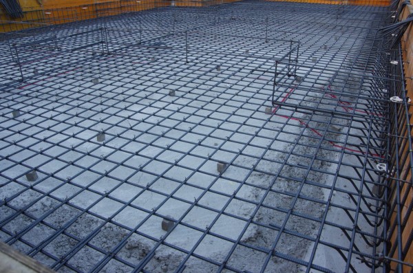 Решетку удобней вязать сразу на месте, то есть, пуская пруток арматуры от одного каркаса к другому. Завязав все продольные прутки, начинают вязать перпендикулярные. Закончив вязать решетку, между прутьями арматуры и щитами опалубки располагают арматурные держатели, которые будут в дальнейшем удерживать всю решетку в приподнятом состоянии и не позволят арматуре лежать на щитах. Закончив с монтажом первой арматурной решетки, над ней на уровне 100 мм вяжется аналогичным способом вторая арматурная решетка. Надо сказать, что для изготовления перекрытий небольшой площади, например при строительстве гаража, нередко изготавливают только одну арматурную решетку, а вместо второй применяют арматурную сетку, уложенную внахлест и связанную проволокой с шагом 20 см.